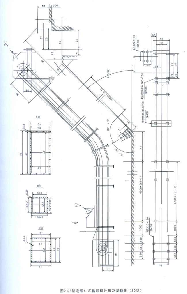 一、 用途概述 | DS型連續鏈斗輸送機是在吸收消化西德先進技術的基礎上,自行改進設計的輸送機,適用于水平或傾斜(傾角≤60o)輸送各種粉狀和塊狀散料,如水泥熟料、鐵渣、礦砂、石灰石、焦碳等。耐熱性和可靠性優于鱗板式輸送機,皮帶輸送機和振動輸送機等,單機輸送最長可達150m左右,并比鱗板式輸送機節電50%以上。所以廣泛用于建材、冶金、煤炭、化工、電力及其它工業部門。 二、 DS型斗式輸送機的布置型式 DS型連續斗式輸送機的布置型式共有五種.見圖1。 |