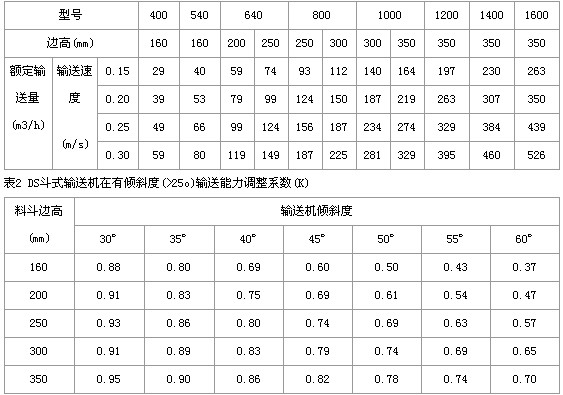 表1 DS型連續斗式輸送機水平輸送時的輸送能力  注: 1.以上數據是以連續裝料為前提的,實際輸送量回轉窯約為額定輸送量的70%~80%,機立窯約為額定輸送量的45%~50%。 2.傾斜輸送(>25o)時的輸送能力其額定輸送量=K×水平輸送時額定輸送量。 表3 輸送機傾角α與λ值關系表 |