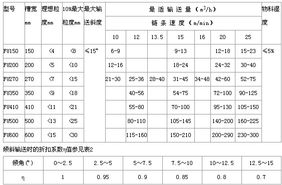 :當輸送機傾斜放置時,輸送量將減少,這時,實際實際輸送能力為表1的數值乘以折扣系數η值。